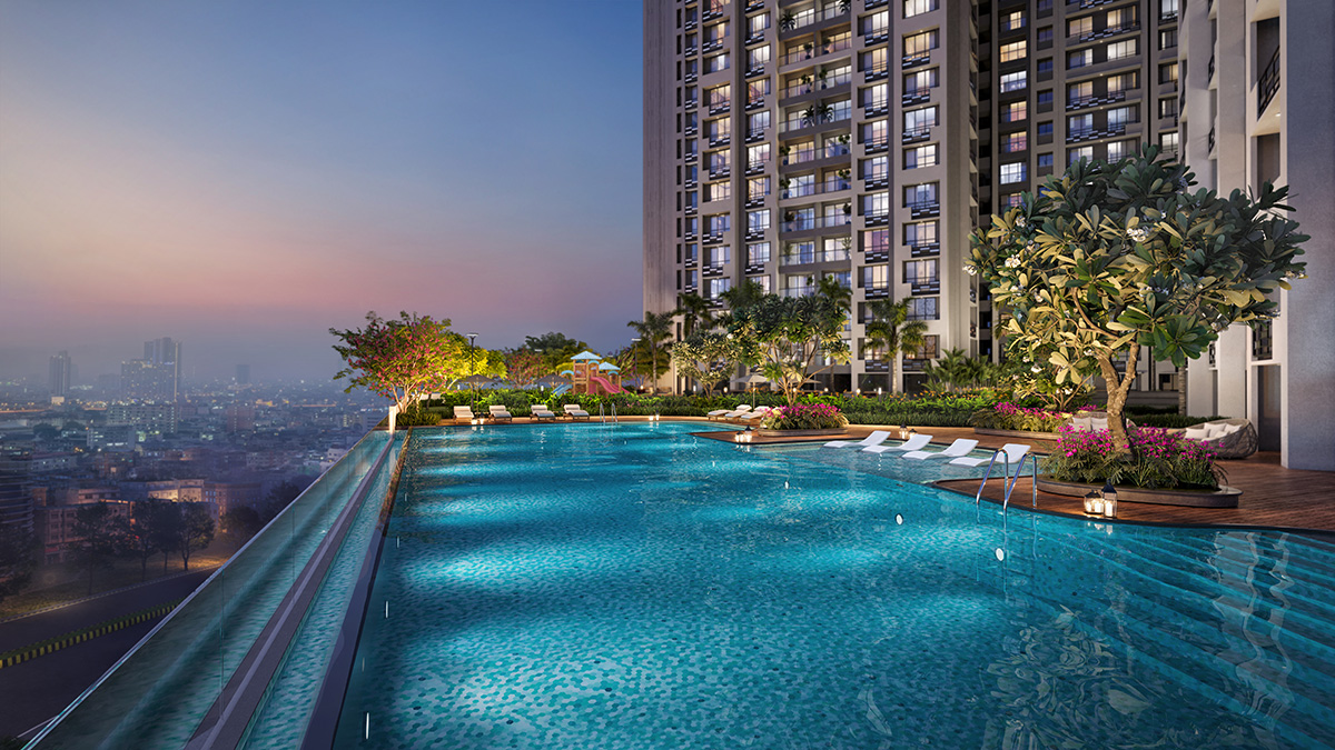 Dosti Wagle 604 features exclusive Leisure and Sky Decks including an Infinity Pool, Star Gazing Corner, Sky Gym, Pickleball Court, Mini Golf, and a Business Centre with Conference Rooms.